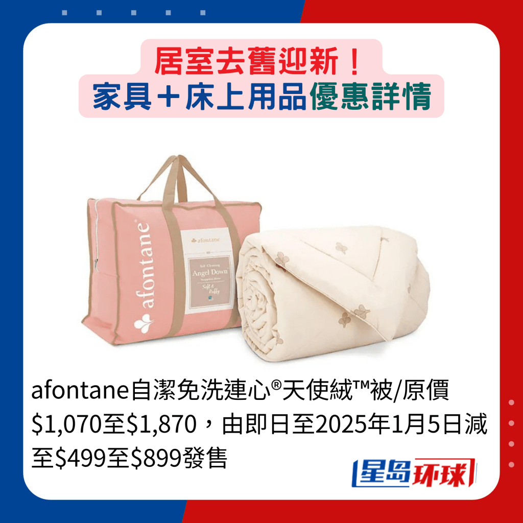 床褥、床單、被單及枕頭等床上用品,向來都是“送舊迎新”的熱選。主售床上用品的afontane雅芳婷,由即日至2025年1月5日,指定全棉卡通床品以接近半價發售,自潔免洗連心天使絨被更低于5折,原售$1,070至$1,870,減至$499至$899,切合季節保暖需要。