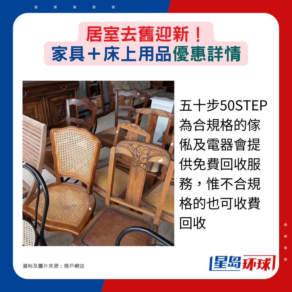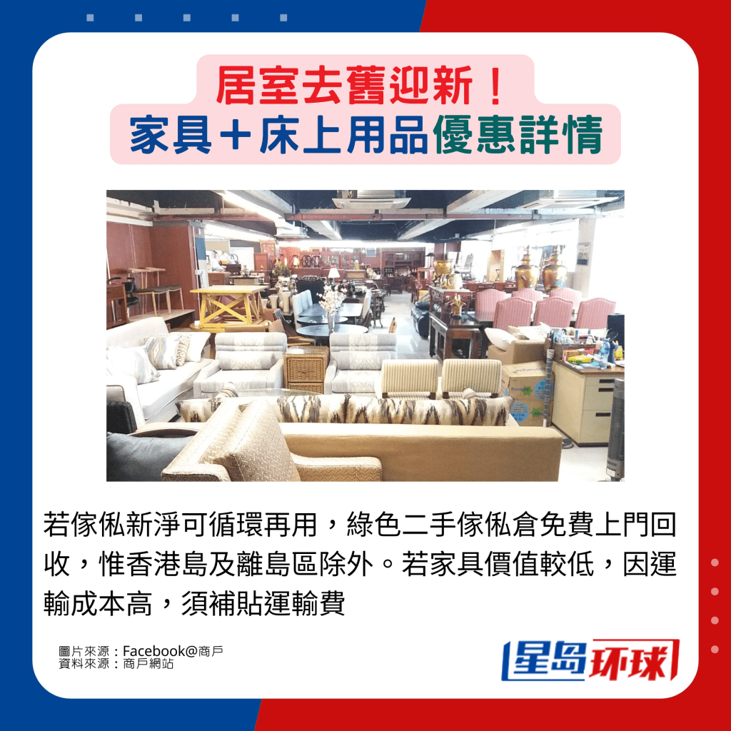 添置新家品的同時,也要處理舊家具,不一定要將之棄掉,相反可賦予它們第二生命。綠色二手家私倉提供免費上門回收服務,必須先將家具的照片及資料傳送到指定WhatsApp或電郵,確認合資格后才進行回收行動,他們會扣除基本營運開支,以低廉價錢再轉售家私。另一商戶五十步50STEP,同樣提供免費上門回收合規格家私和電器的服務, 并經維修翻新再出售,留意不合規格的物品則需要收費回收。