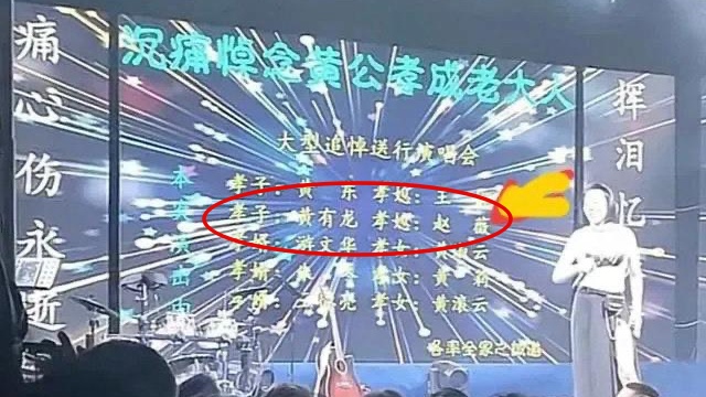原來黃家舉辦“大型追悼送行演唱會”,過的是喜喪,現場樂隊伴奏,數名歌手演唱,還放起煙火。黃有龍、趙薇均未現身。不過螢幕打出孝子、孝女,以及孝媳、孝婿的名字,趙薇的名字也在列。
