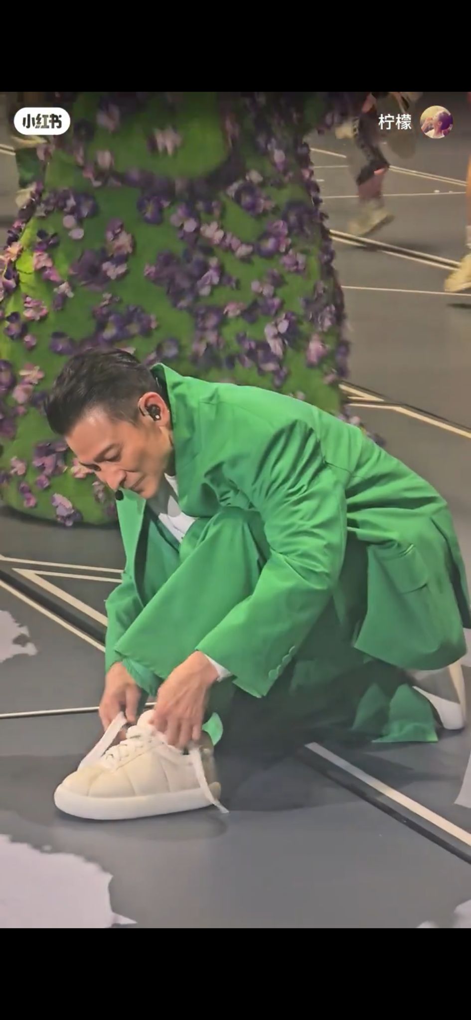 較早前,有劉德華粉絲在小紅書分享一段,劉德華在演唱會臺上的表現。從片段可見,華仔在穿上一套綠色玩味甚濃的表演服,腳上則穿上一對白色球鞋。出名認真專業的華仔,忽然在臺邊跪下,被粉絲全程直擊。