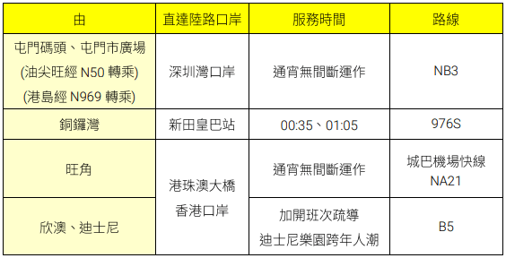 城巴亦為旅客提供市區連接機場、深圳灣口岸、落馬洲(新田皇巴站)及港珠澳大橋香港口岸的通宵巴士服務。