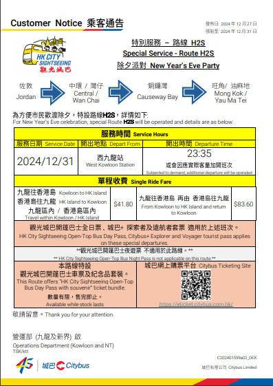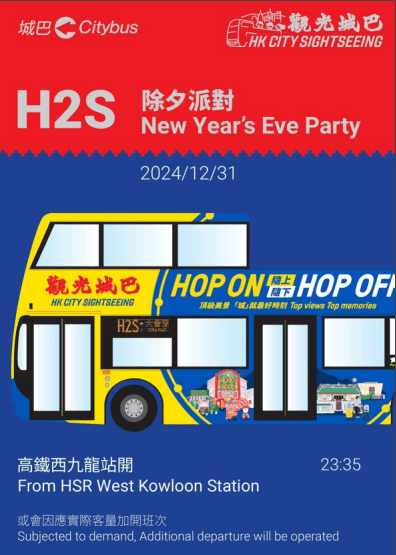 ▲城巴將于跨年夜開辦“除夕派對”H23,安排12輛開篷巴士,于除夕晚上11 點35分由西九龍站出發。