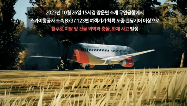 該段防災演習片由韓國政府行政安全部在2023年底制作,主要針對全羅南道務安郡空難救災訓練,從影片可見,模擬災難事故設定為2023年10月26日下午3時,一輛波音737編號123客機在務安國際機場降落途中,起落架突然發生故障,無法順利降落,迫降時偏離跑道,隨后撞上建筑物外墻,引發火災。
