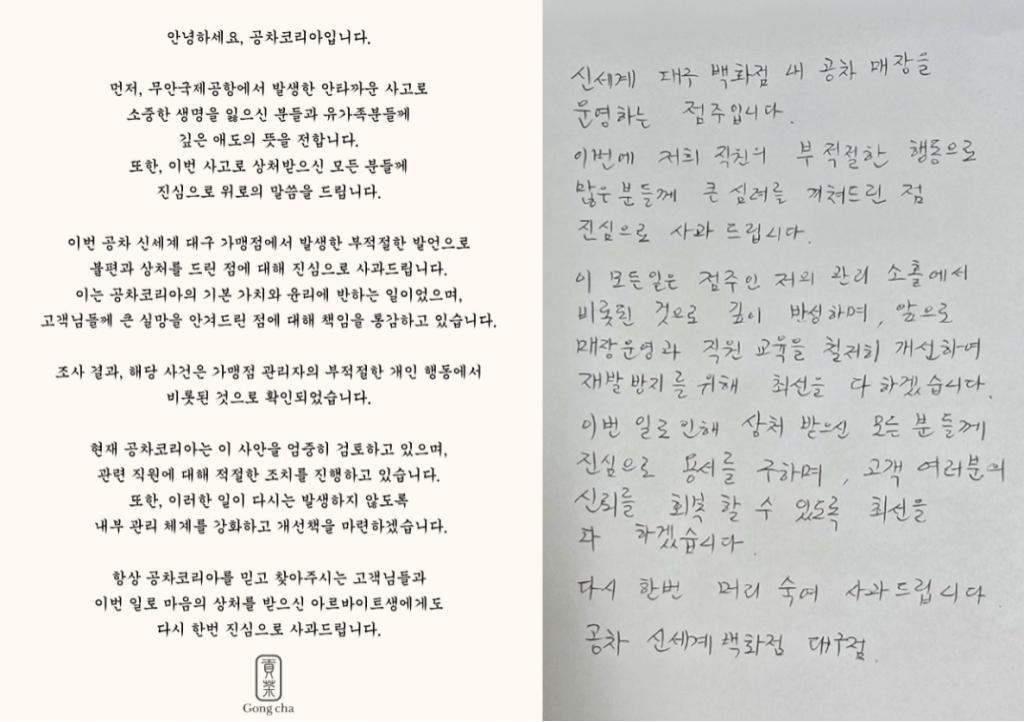 ▲韓國貢茶周一(30日)急忙在官網發出公司聲明,更附上加盟店主管的手寫信致歉。
