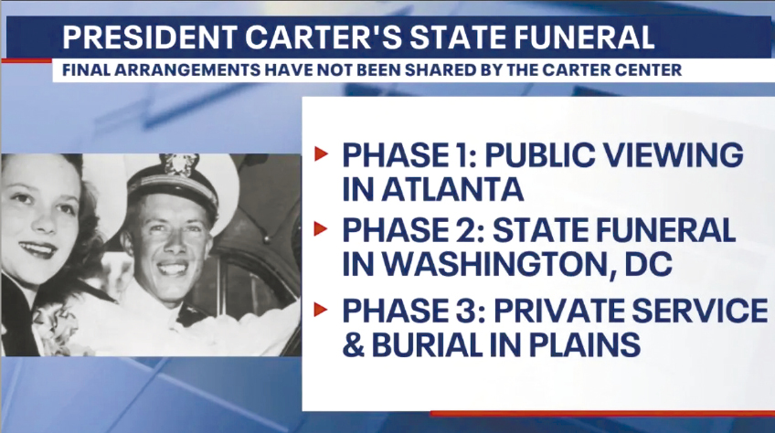 ▲前總統卡特將于明年1月9日在華盛頓舉行國葬,屆時總統拜登會致悼詞,大部分聯邦政府部門將暫停服務,紐約證券交易所當天休市。 電視截圖