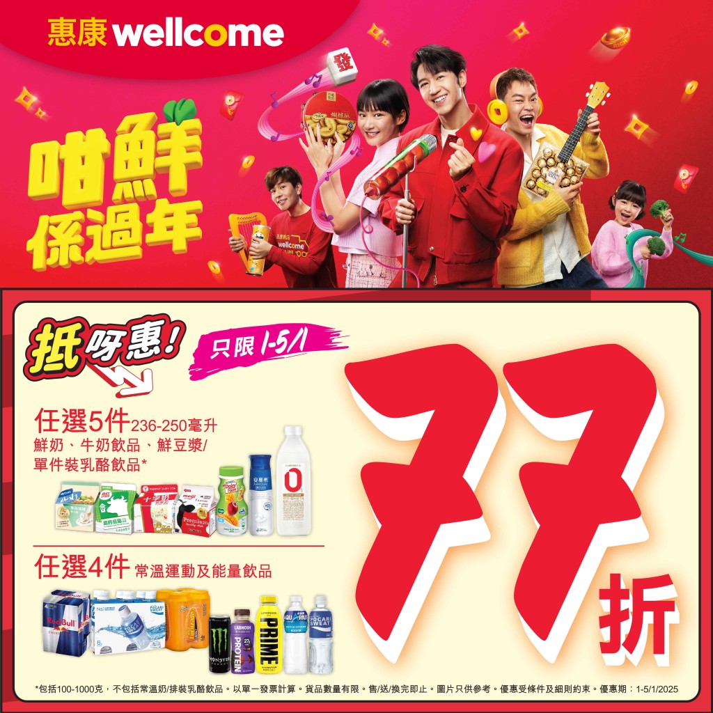 小朋友早餐必備鮮奶、豆漿,惠康就特別于2025年1月1日至5日^,推出快閃優惠,凡于惠康購買指定5件豆類及奶類飲品(包括鮮奶*/牛奶飲品*/鮮豆漿*/單件裝乳酪飲品#),即可享77折優惠!另外,購買任何4件常溫運動及能量飲品,亦可享77折,讓大家于新一年充滿能量! 同步亦有多款人氣酒品折扣優惠,如Asahi 朝日啤酒、K1664白啤酒、奔富紅酒等,讓大家可于佳節暢飲!媽媽還要留意金象牌頂上茉莉香米和維達4D立體壓花衛生紙,均以激抵優惠價發售!