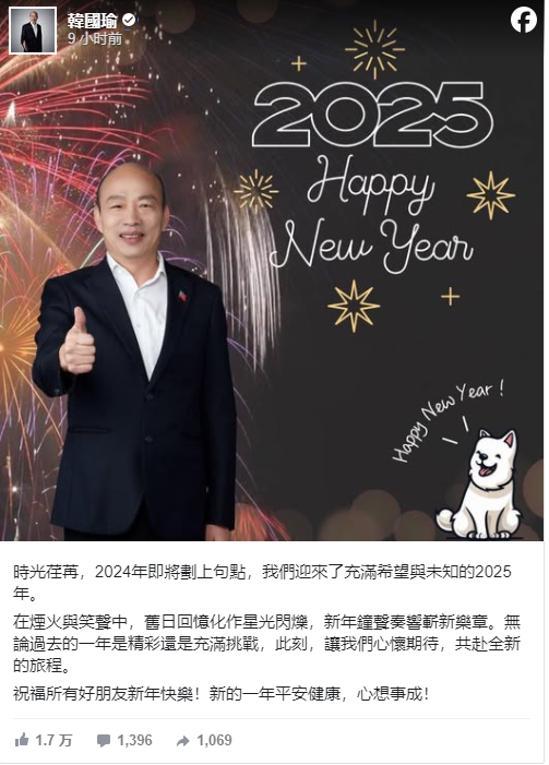 2025年的第一個時刻,韓國瑜在臉書發文,時光荏苒,2024年即將劃上句點,迎來了充滿希望與未知的2025年。