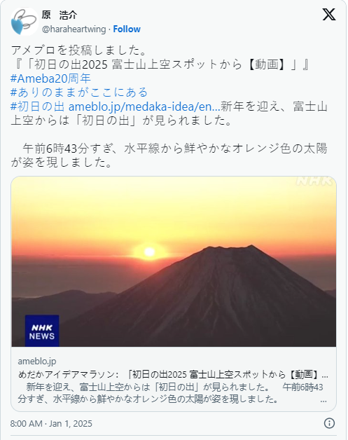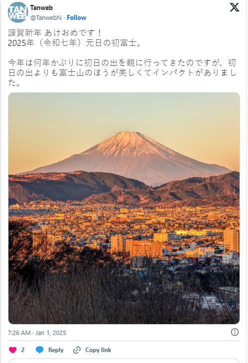日本網友也紛紛分享今天清晨朝圣富士山元旦第一道日出的超美成果。