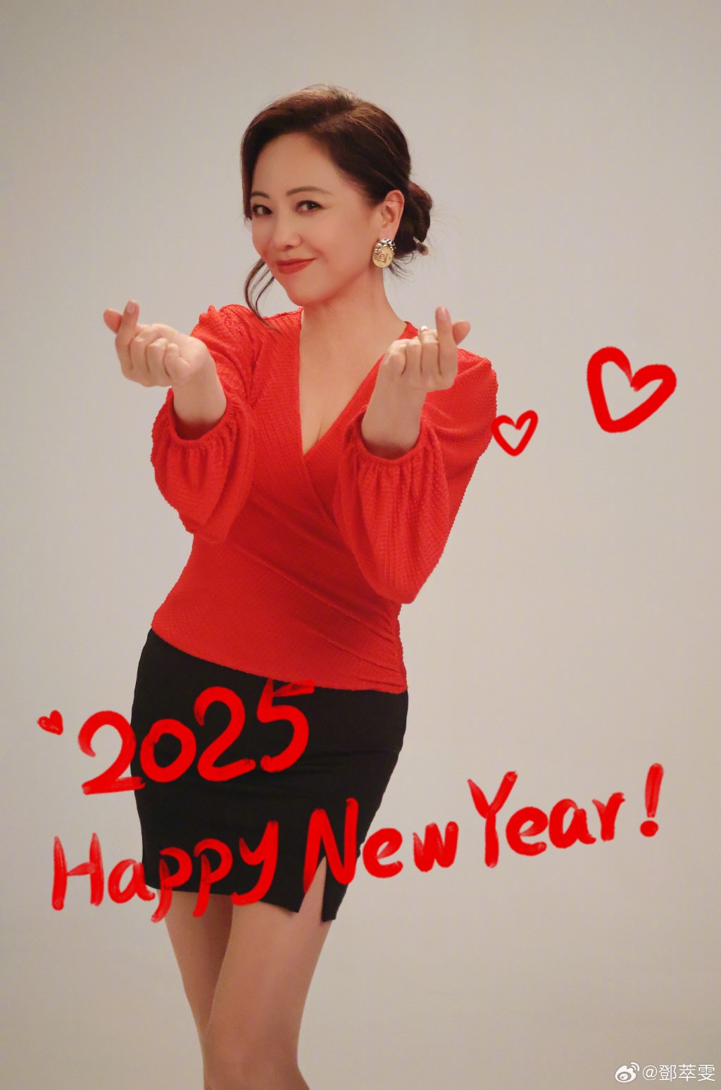 ▲鄧萃雯12月31日在社交網貼出一張照片,見她扎起頭發,化上精致妝容,身穿紅色低胸上衣,輕露事業線,下身配以黑色高衩短裙大曬美腿,更做出心心手勢。