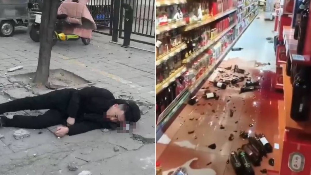 ▲寧夏銀川永寧縣發生4.8級地震,有民眾被震碎的外墻物料擊傷倒地,超市貨架紅酒被震跌。