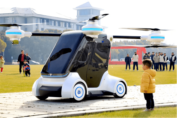 ▲“東大·鯤鵬1號”飛行汽車是國內首輛全輪轉向全輪驅動、四軸八槳構型飛行汽車。
