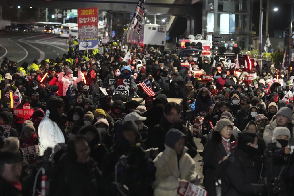 ▲在首爾總統官邸附近,被彈劾的韓國總統尹錫悅的支持者舉行集會,反對法院發出逮捕尹的逮捕令。 美聯社