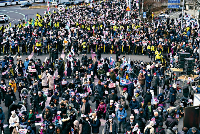 ▲總統尹錫悅的支持者周五在首爾總統官邸附近集會,抗議法院簽發拘捕令拘捕尹錫悅。