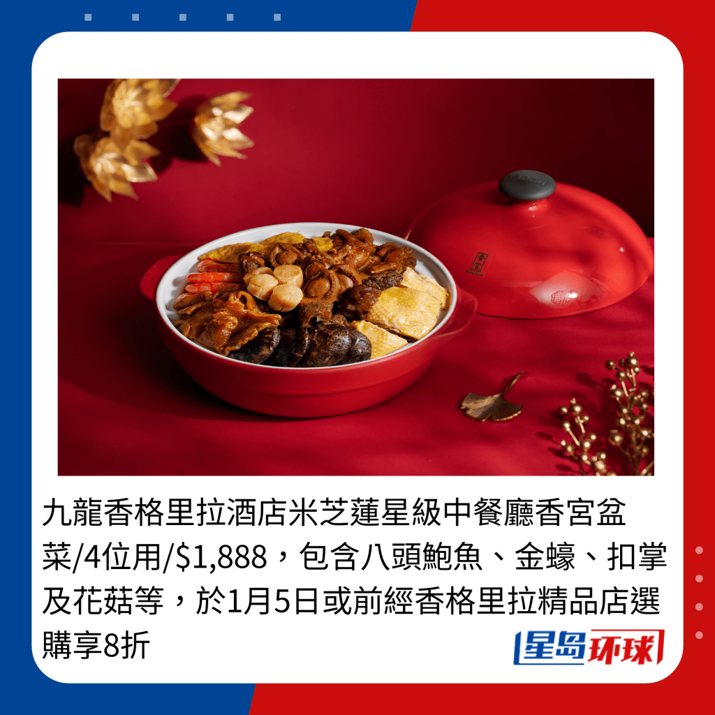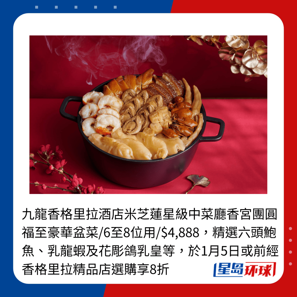 一年一度的新春佳節,若想一家人“豪”食一頓,著名酒店與坊間中菜餐廳出品的盆菜都是不二之選。九龍香格里拉酒店的米芝蓮星級中菜館香宮的團隊,精心炮制香宮盆菜及團圓福至豪華盆菜,前者份量供4位用,包含八頭鮑魚及金蠔等逾18款珍貴食材,而后者份量則供6至8位用,食材包括六頭鮑魚、乳龍蝦及花彫鴿乳皇等,只要于1月5日或前經香格里拉精品店選購,即享8折,想大嘆星級佳肴就要把握時間!