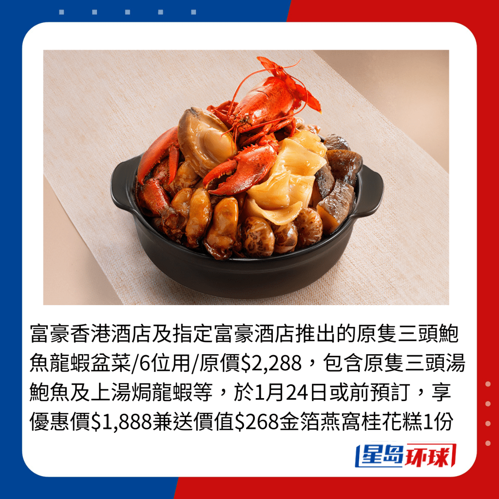 此外,指定富豪酒店亦推出不同的新春盆菜,除了供6位用的原只三頭鮑魚龍蝦盆菜,以及4位用的原只花膠鮑魚盆菜之外,還有供6位用的極上珍菌原只素鮑齋盆菜,滿足不同人士的需要,于1月24日或前可以優惠價預訂,兼獲贈價值$268的金箔燕窩桂花糕1份,抵上加抵,另可選擇外賣自取或堂食。