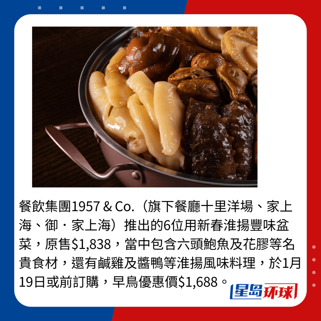喜歡特色風味的盆菜,也不乏選擇。同樣提供堂食或外賣自取的新加坡福建餐廳莆田,其“盆滿缽滿鮑魚大蝦盆菜”包含莆田南日島的八頭大鮑魚、莆田哆頭村的蟶干及福州魚丸等美食,只要于1月11日或前預訂及繳付訂金,可享88折。至于餐飲集團1957 & Co.的6位用新春淮揚豐味盆菜,當中包含六頭鮑魚及花膠等名貴食材,還有咸雞及醬鴨等淮揚風味料理,原售$1,838,趕及1月19日或前訂購,可享早鳥優惠價$1,688。