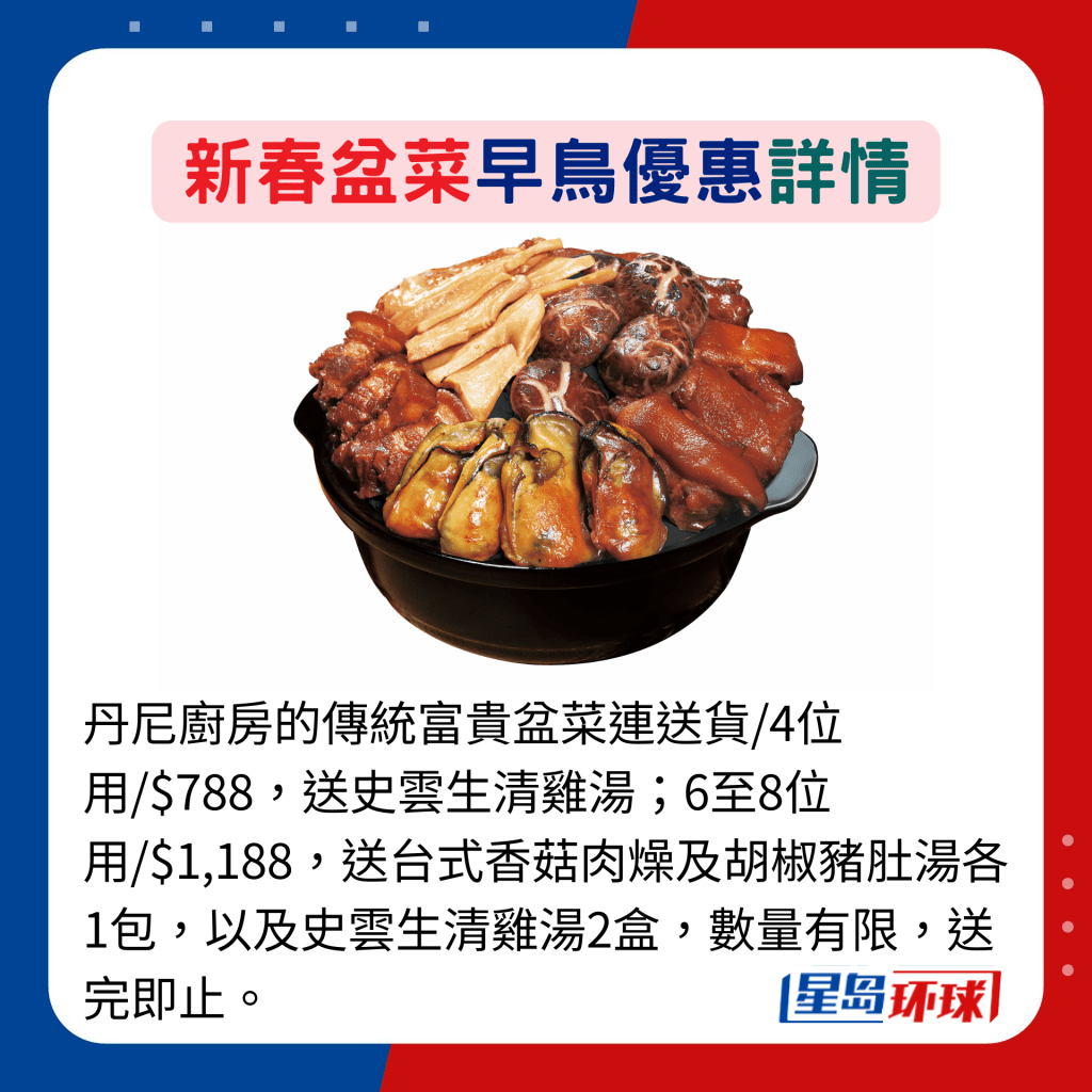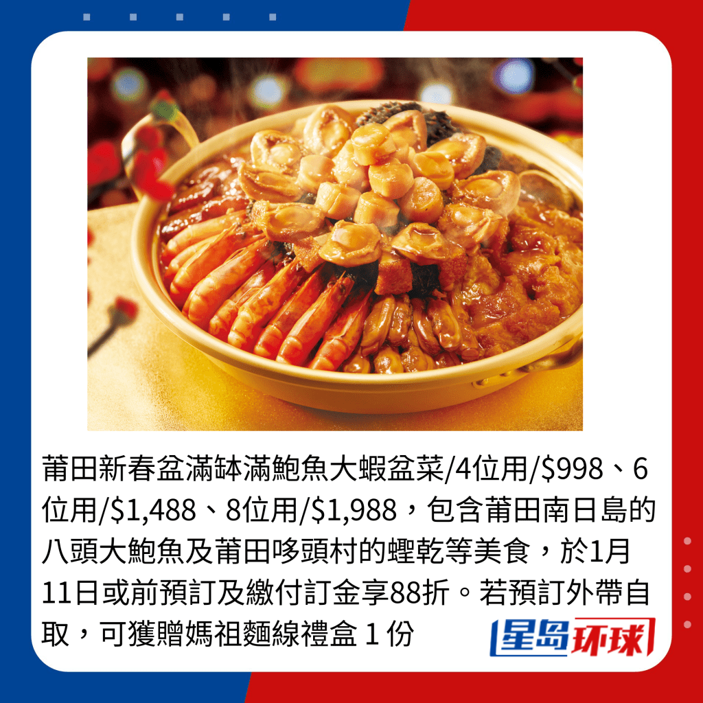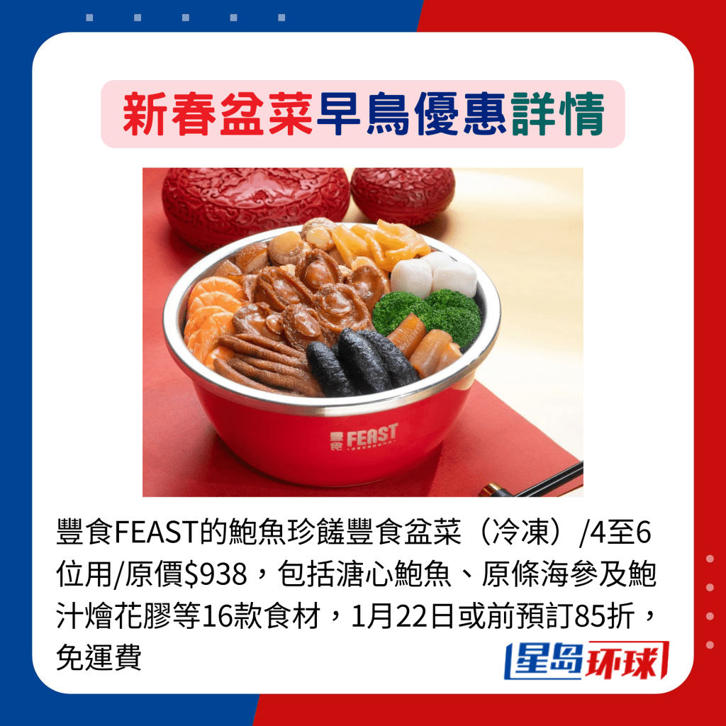 想足不出戶嘆盆菜?!外賣到會最方便,款式多元化兼有禮品,好像丹尼廚房的至尊鮑魚盆菜、傳統富貴盆菜及極上素盆菜,既可滿足不同口味,又可選擇不同份量,更會獲送各款贈品,如訂購8至10位用的極上素盆菜,即獲贈鮮菇湯。專門提供節日到會及上門餐飲服務的豐食FEAST,新推的鮑魚珍饈豐食盆菜(冷凍)盆菜,就有溏心鮑魚、原條海參、鮑汁燴花膠及鴨掌等16款食材,可供4至6位用,趕及1月22日或前預訂,享85折兼免運費。
