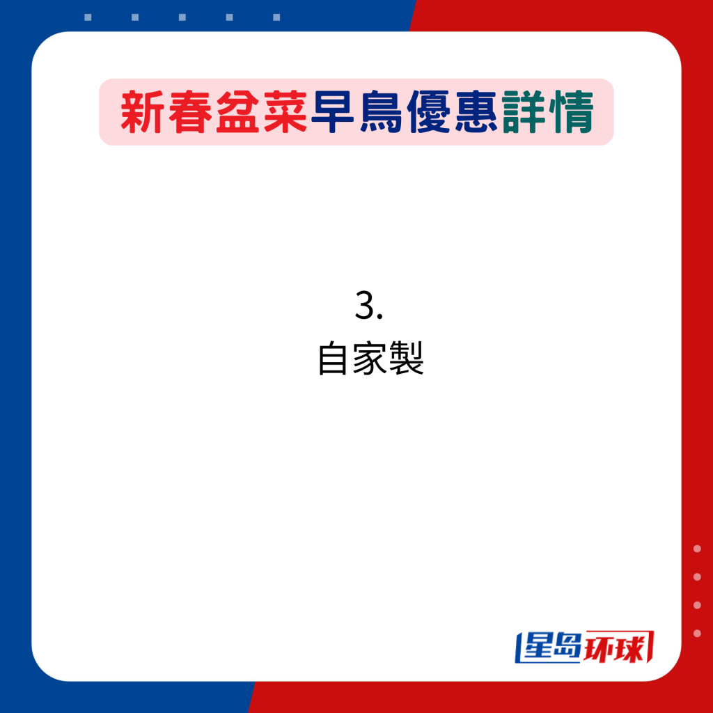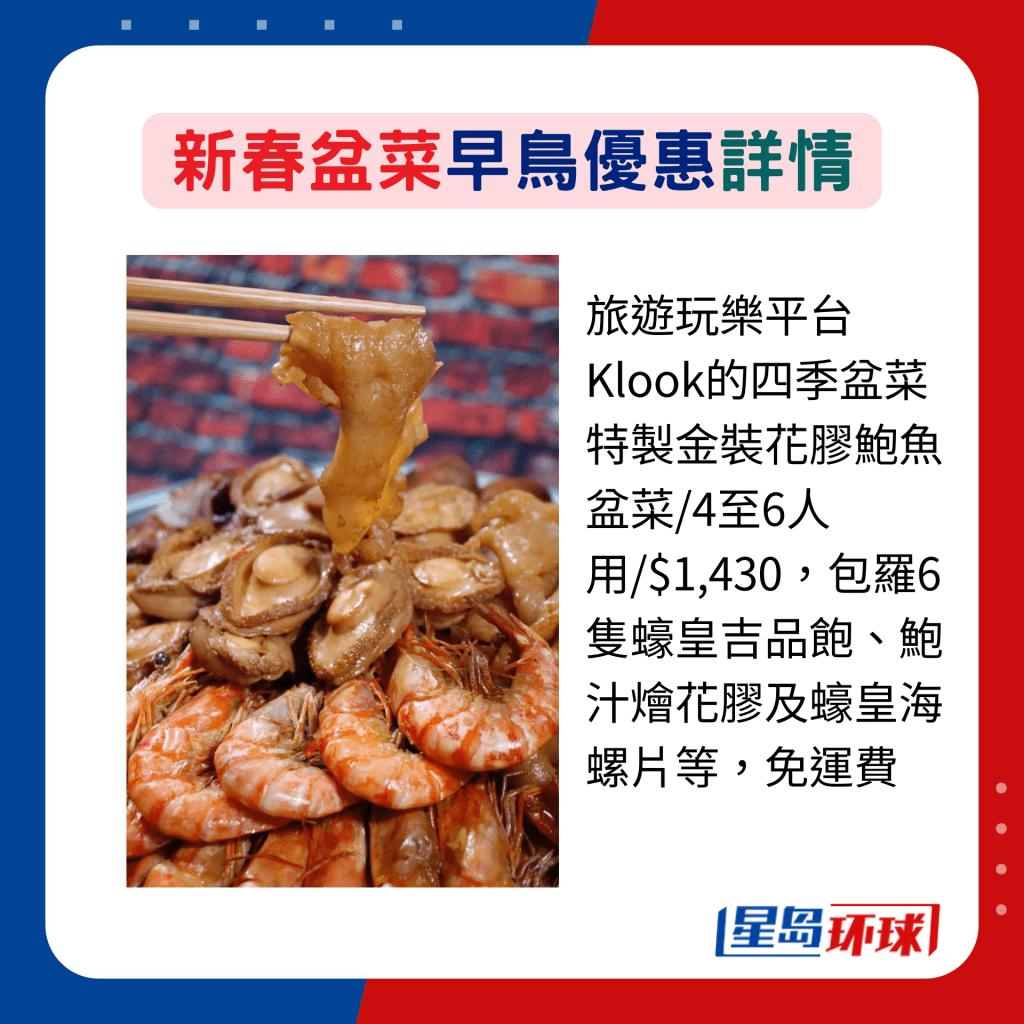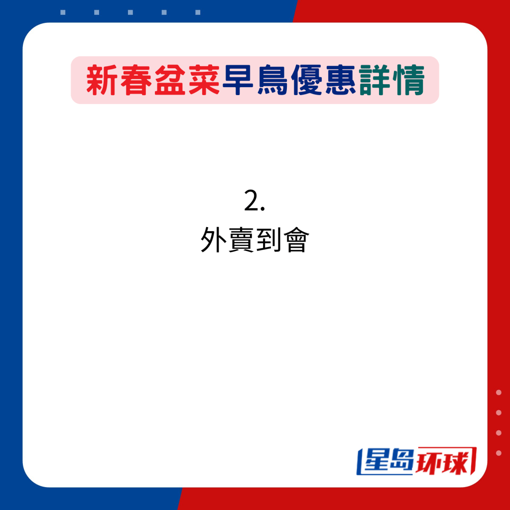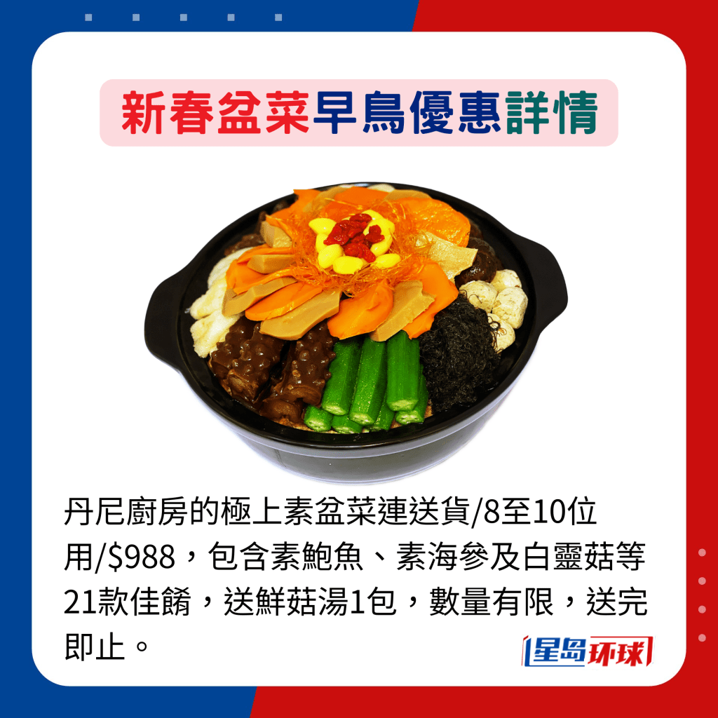 想足不出戶嘆盆菜?!外賣到會最方便,款式多元化兼有禮品,好像丹尼廚房的至尊鮑魚盆菜、傳統富貴盆菜及極上素盆菜,既可滿足不同口味,又可選擇不同份量,更會獲送各款贈品,如訂購8至10位用的極上素盆菜,即獲贈鮮菇湯。專門提供節日到會及上門餐飲服務的豐食FEAST,新推的鮑魚珍饈豐食盆菜(冷凍)盆菜,就有溏心鮑魚、原條海參、鮑汁燴花膠及鴨掌等16款食材,可供4至6位用,趕及1月22日或前預訂,享85折兼免運費。