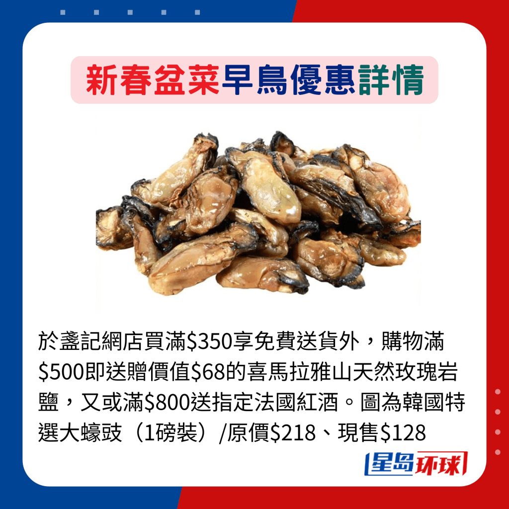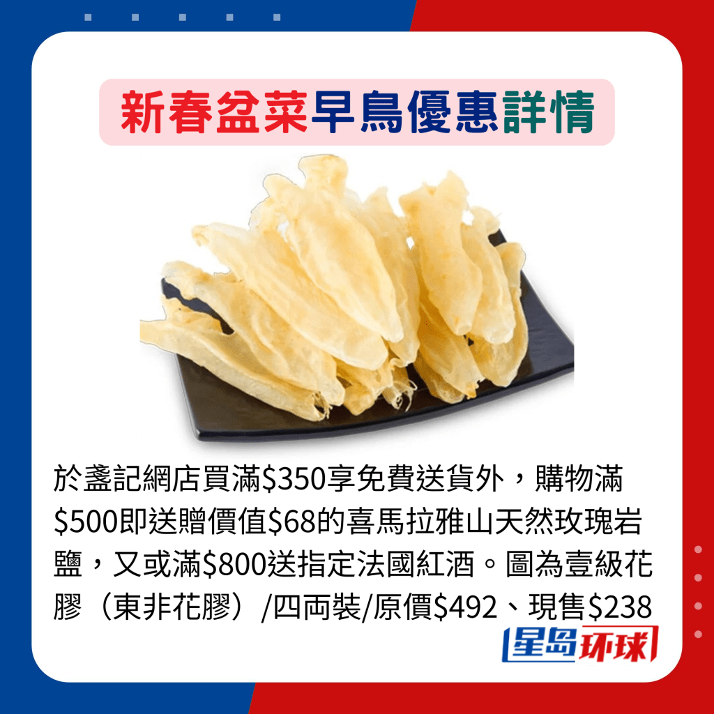 打算自制盆菜,必備珍貴海味食材,南北行網店由即日至1月20日推出優惠,折實買滿$500,即送鮑汁螺片1罐。 期間單一訂單計折實買滿$800,即送電子現金券$50,可于下次購物滿$500時使用。主售參茸海味產品的盞記,其網店亦推出多項購物優惠,除了買滿$350享免費送貨外,購物滿$500即送贈價值$68的喜馬拉雅山天然玫瑰巖鹽,又或滿$800送指定法國紅酒。