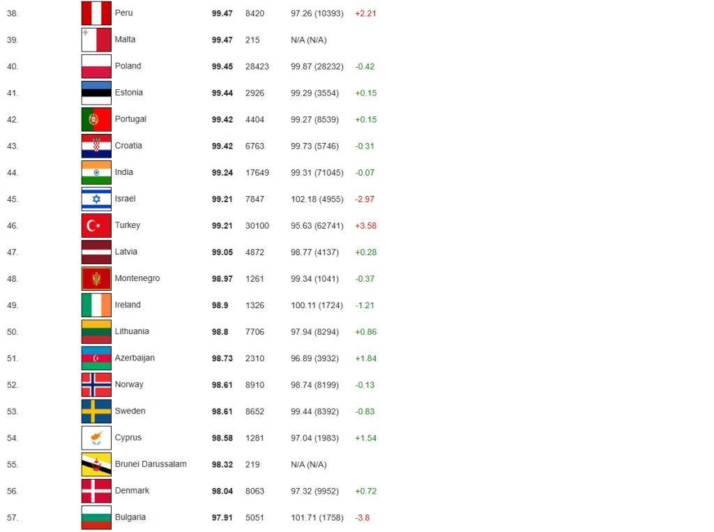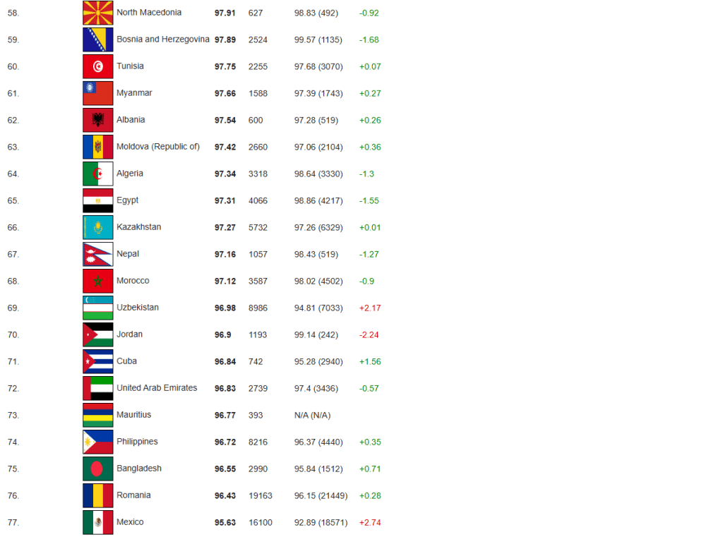 智商檢測機構International IQ Registry(國際智商登記處)公布最新數據,列出全球127個國家的智商排名。中國以平均智商107.43位居榜首,韓國、日本及新加坡分別奪得第3至第5名。俄羅斯則以平均智商103.31排名第6;美國則以100.17排名第27。