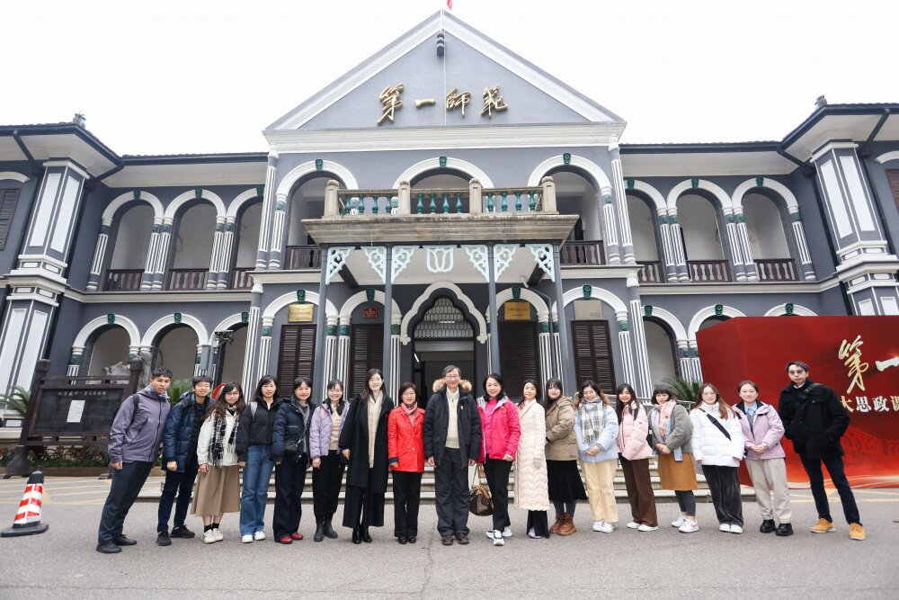 ▲教大校長、教職員與學生在第一師范舊校舍前合照