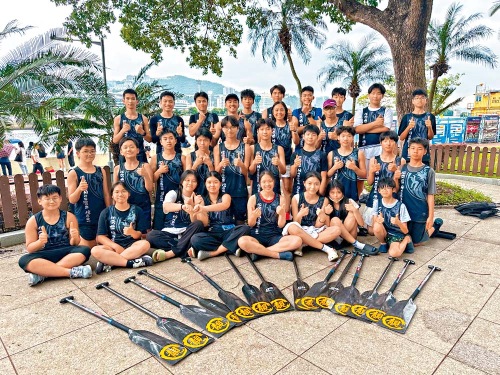 ▲龍舟隊隊員黃文濤同學(2A)、李詠滔同學(6B)、梁東霖同學(6A)、江泰言同學(2A)、簡振義同學(1B)相當享受龍舟隊的氣氛。