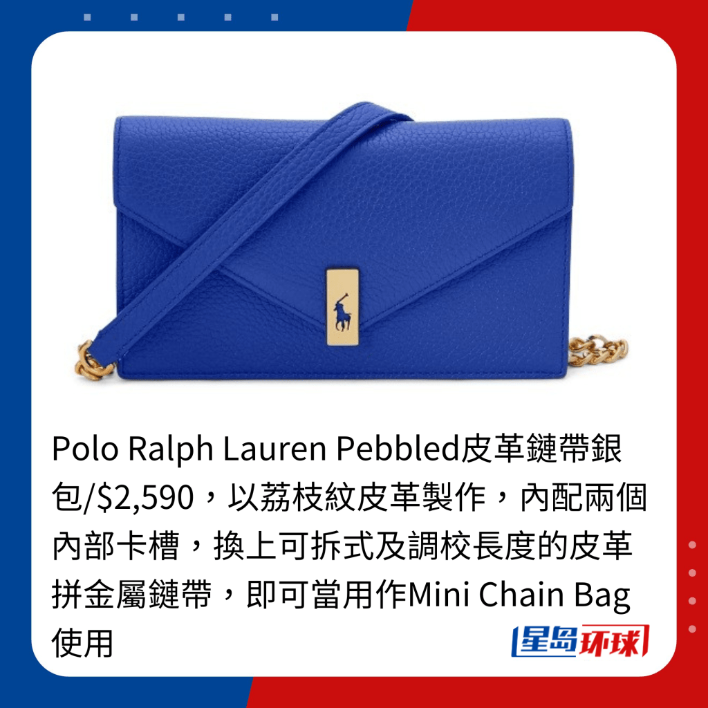 Polo Ralph Lauren新推的皮革鏈帶錢包,以荔枝紋皮革制作,配以兩個內部卡槽,只要換上可拆式及調校長度的皮革拼金屬鏈帶,即可當用作Mini Chain Bag使用。至于MICHAEL MICHAEL KORS的全新帆布拉鏈錢包,內設多個卡槽及拉鏈袋,附有的手挽細節,方便攜帶。
