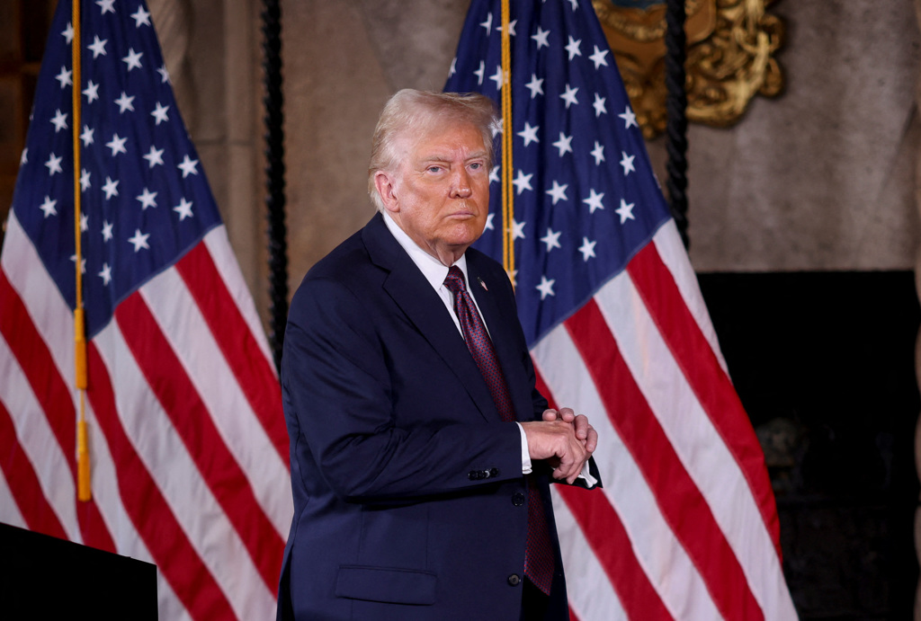 ▲特朗普即將二度擔任美國總統,7日在佛州海湖莊園發表談話。(路透)