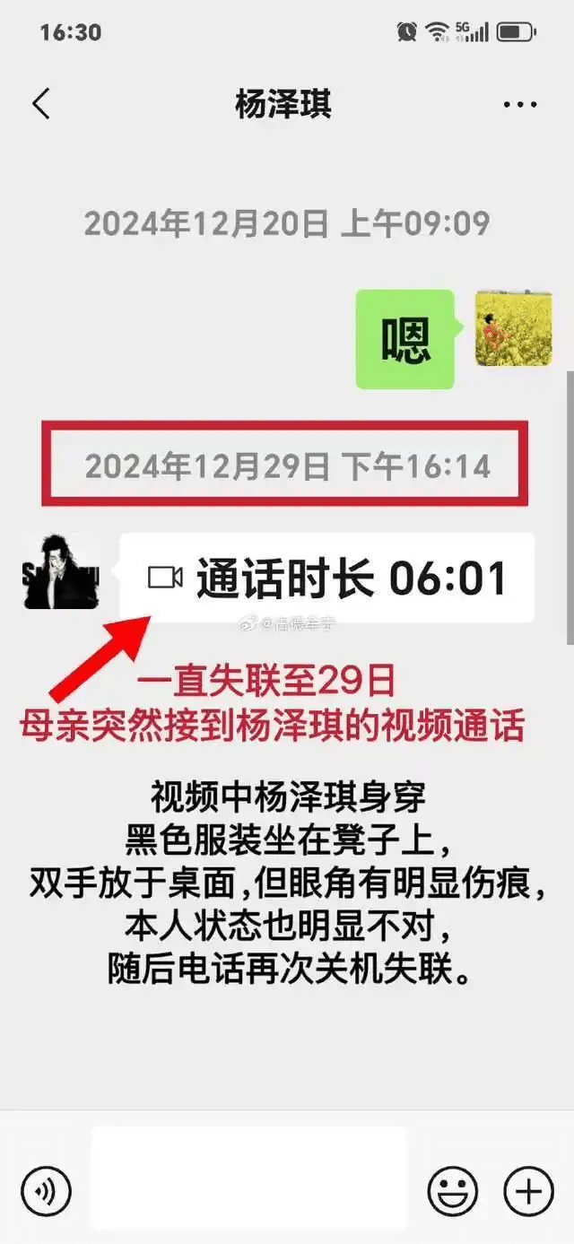 ▲楊澤琪與母親打了視頻通話報平安,據稱眼角有明顯傷痕。