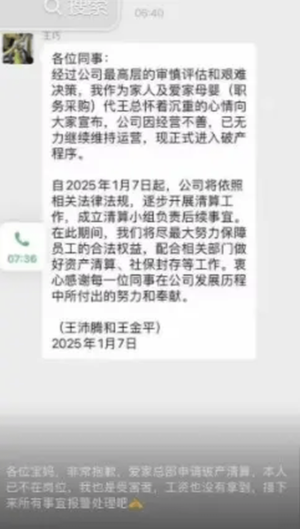 網絡流傳的愛家月子中心員工微信群截圖顯示,有管理人員自稱代法定代表人對員工宣布,公司由于經營不善,已無力繼續維持運營,正式進入破產程序。 發言落款日期為1月7日。