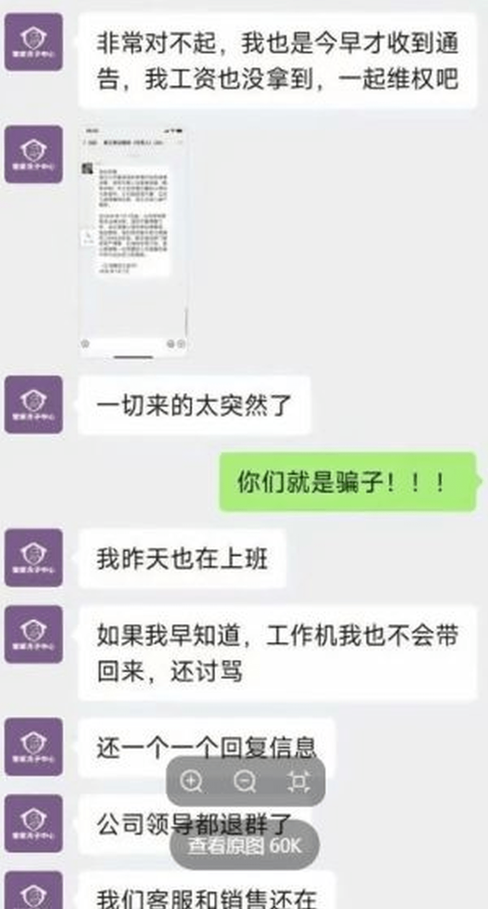 ▲網傳員工與工作人員聊天記錄,雙方均稱是受害者。