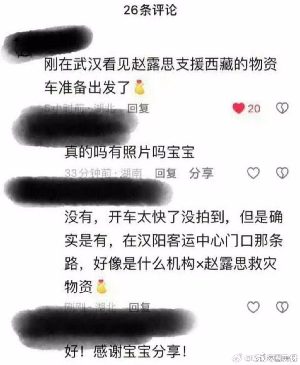 網友也發現,有一臺紅色大貨車,上面綁著紅布條,寫著“趙露思,緊急馳援西藏!”原來,目前正在專心養病的趙露思,把支援的物資,從武漢發車至西藏,低調地替災區盡一份心力,愛心不落人后。許多網友忍不住盛贊:“趙露思生病了還在做著公益”、“很善良的小女孩”、“趙露思真的是太有愛心了,希望未來越來越好”、“正能量我的女神,支持”、“特別好的小女孩,一直在默默堅持公益,今天如果不是被人偶遇,可能會一直都不知道這件事”。