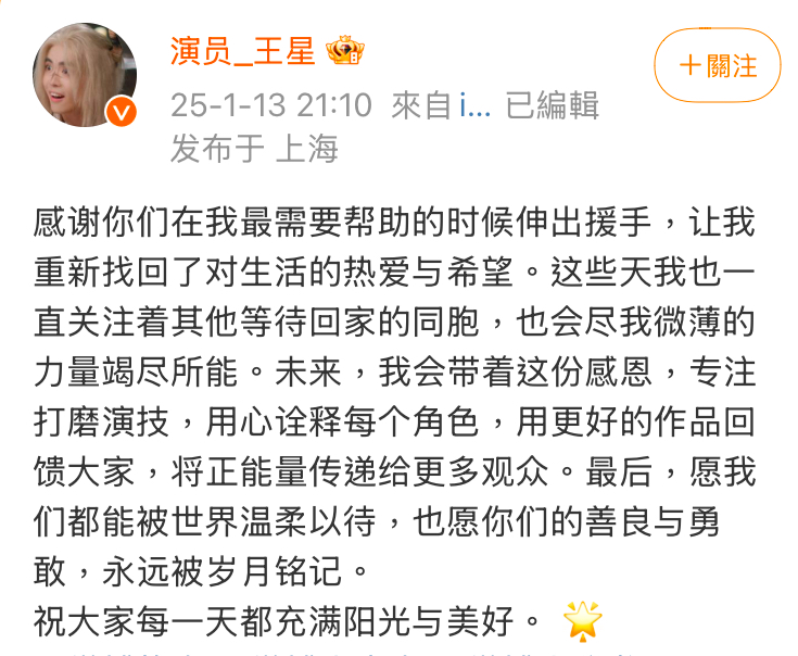 王星寫道:“感謝你們在我最需要幫助的時候伸出援手,讓我重新找回了對生活的熱愛與希望。這些天我也一直關注著其他等待回家的同胞,也會盡我微薄的力量竭盡所能?!?/p>