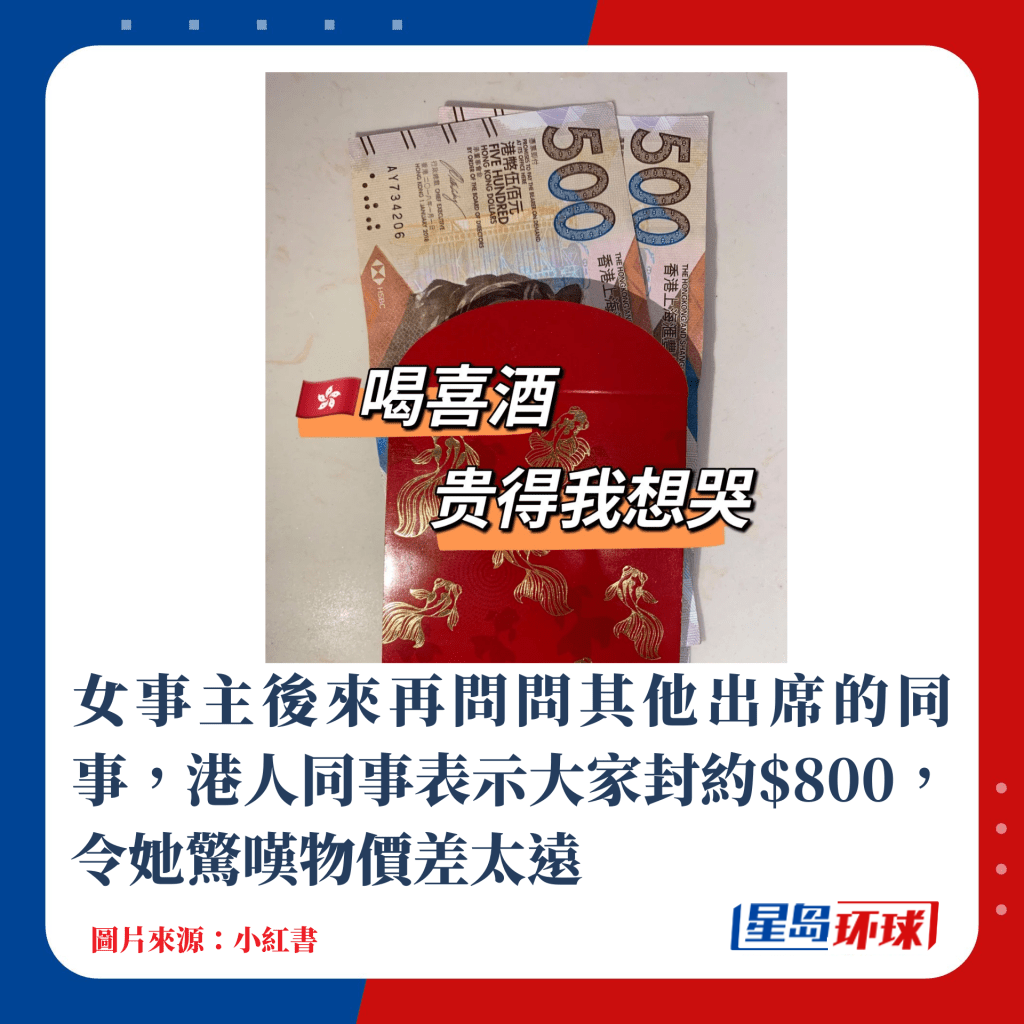 內地香港兩地于生活習慣、習俗或是文化有別,一位內地女于小紅書上分享,她早前受邀出席前同事結婚飲宴,發現兩地的飲宴文化原來既有相似,同時也有大不同之處,特別是人情文化(指的是為了維持人與人之間相互聯系的一種生存關系而產生的一種文化,表現為逢年過節互相送禮、婚喪嫁娶隨份子,以維護這種人情關系。)令她大為驚嘆。內地女發現人情相差近3倍,慨嘆內地香港兩地物價差距。