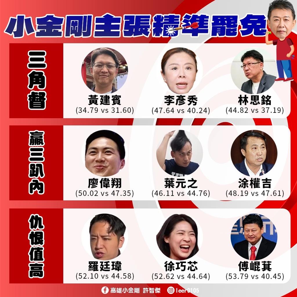許智杰列出9位藍委,包含三角督的黃建賓、李彥秀、林思銘,贏3%內的廖偉翔、葉元之、涂權吉,以及仇恨值高的羅廷瑋、徐巧芯、傅昆萁。