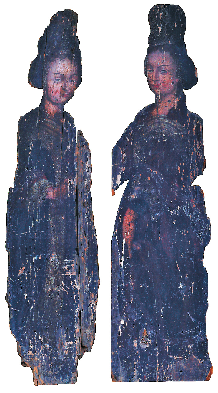 在珠三角江門市新會博物館,珍藏著一套被譽為“木美人”的藝術品。這是一對繪制在厚度約4厘米木板上的女性肖像油畫,畫中女子幾乎與真人一樣大小,采用西方古典油畫技法繪制,體態婀娜、眉目傳神、栩栩如生,面目帶有西洋女子特征。其造型與技法同歐洲十五六世紀繪畫中描繪女子及圣母像的方式相近。但著裝為明代服飾,漢式發髻?!澳久廊恕北徽J為是中國現存最早的油畫實物?!澳久廊恕钡哪甏两裎从卸ㄕ?,有“明代中葉說”,也有人認為是明代晚期至清早期的作品。