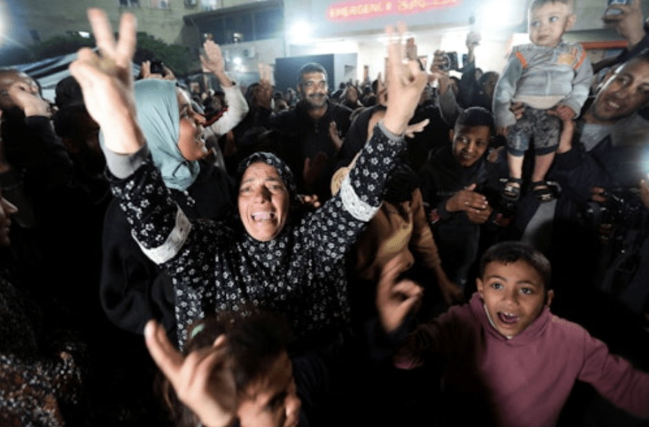 加沙居民經歷長達15個月的戰火蹂躪,面臨食物、水和燃料嚴重短缺困境,許多人無家可歸,當昨日?;鹣鏖_后,大量民眾涌上街頭,歡呼慶祝,整個街頭恍如變身嘉年華會舞臺?!拔液芨吲d,是的,我在哭,但那是喜悅的淚水?!绷麟x失所的五個孩子的母親加達說。