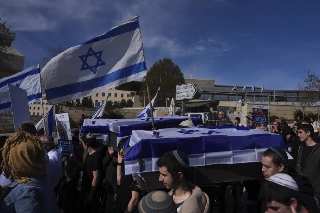 ▲以色列反對加沙?;鸬目棺h者,抬著棺材在耶路撒冷法院前抗議。(圖/美聯社)