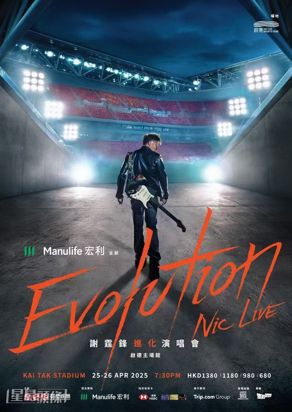 謝霆鋒《Manulife Presents Evolution Nic Live》演唱會將于2025年4月25至26日舉行兩場。演唱會門票票價分為$1380、$1180 、$980、$680。而匯豐信用卡用戶可享優先訂票,優先訂票日期為2025年1月22日晚上12時至1月23日晚上11時59分。