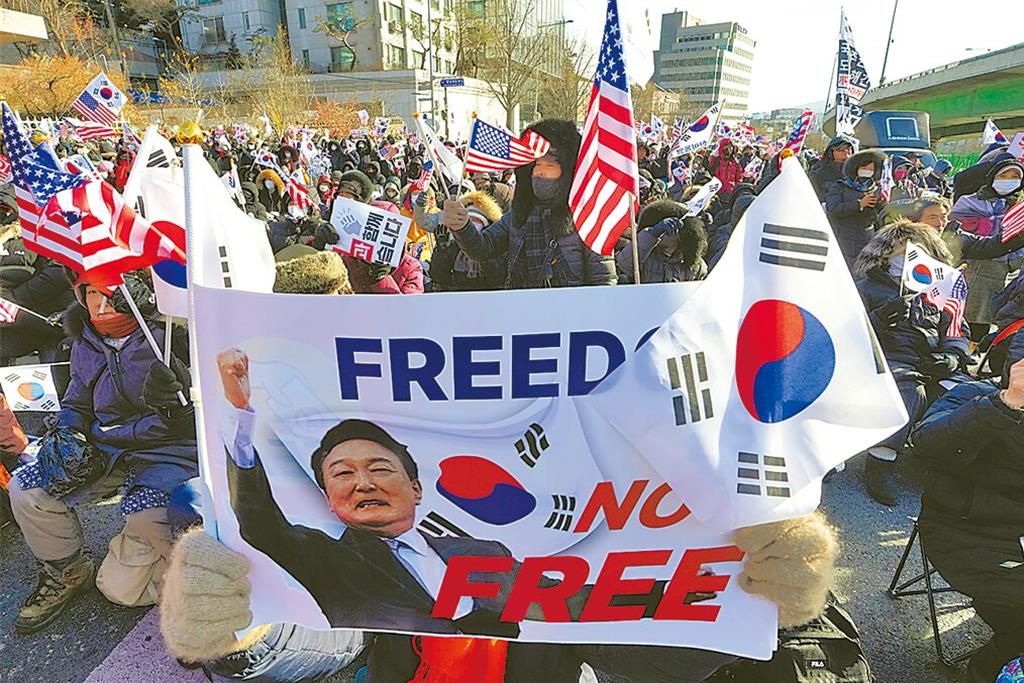 ▲韓國總統尹錫悅被檢調逮捕后,執政黨“國民之力黨”的支持率已反超最大在野黨“共同民主黨”。圖為民眾上街聲援尹錫悅的檔案照。(美聯社)