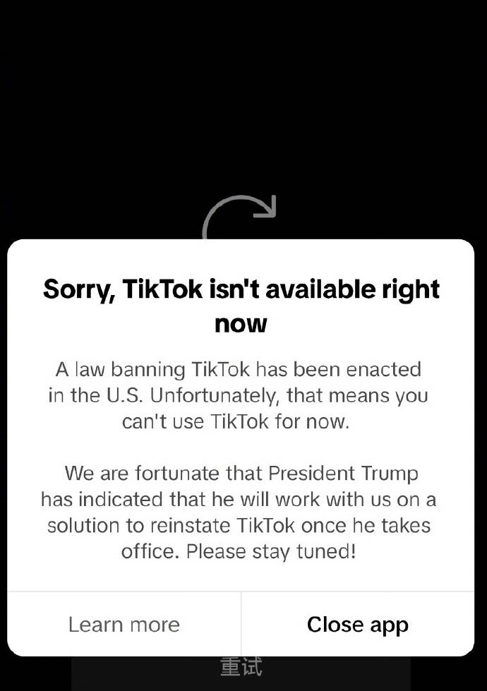 新華社報道,TikTok于美國西岸時間大約18日19時30分開始停止服務,這比外界早前預計比原先時間提早。用戶打開TikTok手機應用程序或官網頁面,會看到一個彈窗通告:“Sorry,TikTok isn't available right now”(對不起,TikTok現已不可用)。
