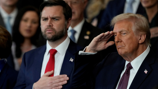 ▲2025年1月20日,美國總統特朗普和副總統萬斯在國會大廈就職典禮上聆聽馬基奧的演唱。(路透社)