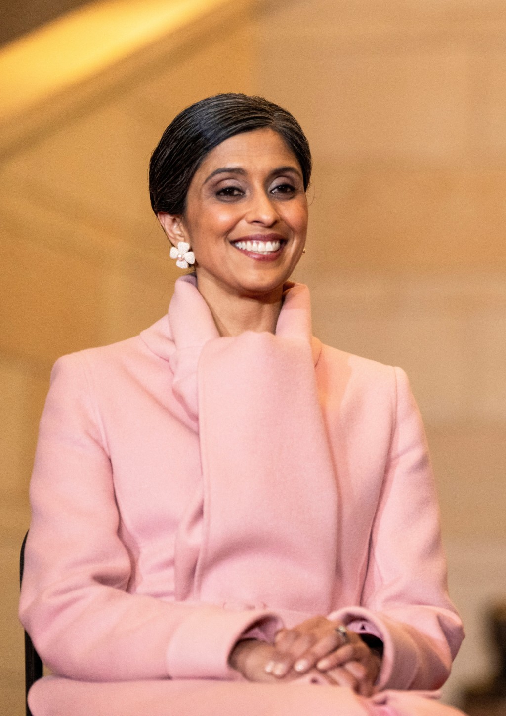 副總統萬斯的妻子烏莎·萬斯,她選擇了一件粉紅色并帶有驚人時尚細節的大衣,她將一條圍巾特意塞進了腰部高度的腰帶里。