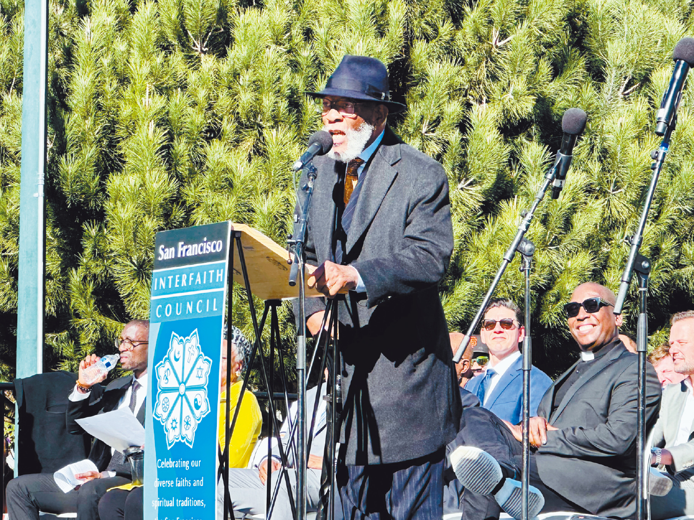 ▲全國有色人種協進會舊金山分會主席布朗牧師發言批評“宗教右翼”。記者洪郁欣攝