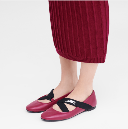 ▲芭蕾舞鞋熱潮 在今個春季回歸,可嘗試這款紅菜頭色配黑色 搭帶的設計。 $ 3,000/Longchamp