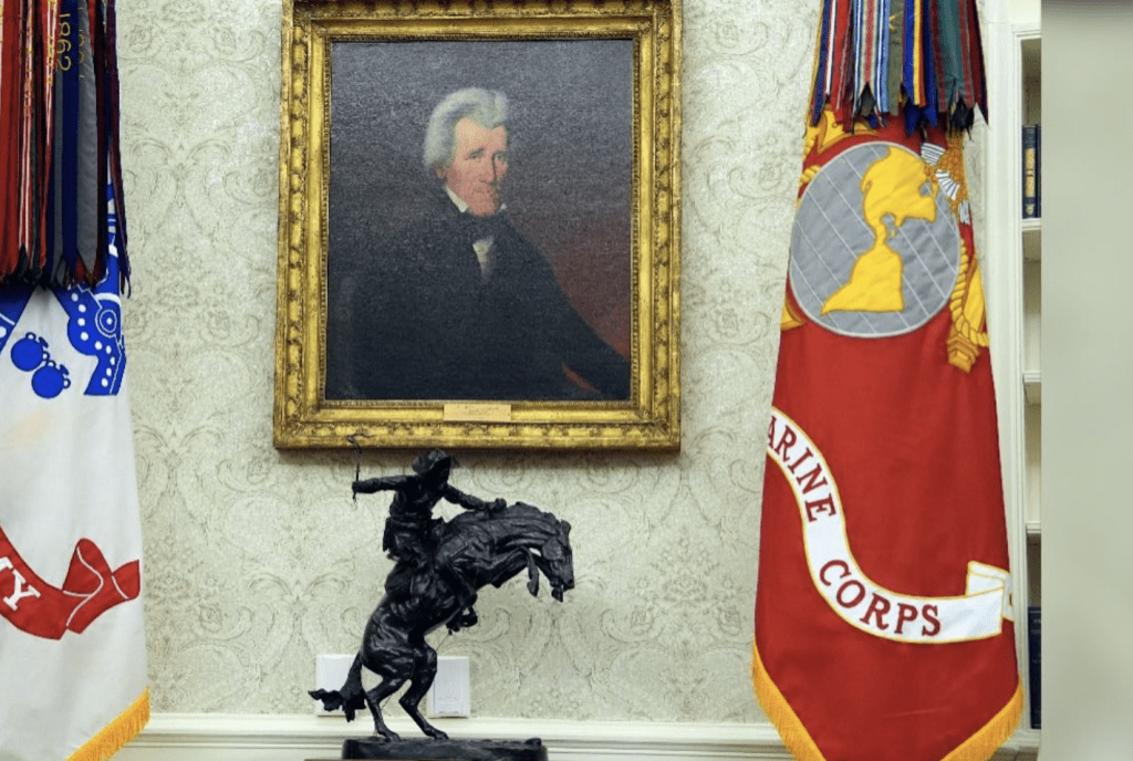 除了重設“可樂按鈕”,橢圓辦公室其他新擺設也反映了特朗普的領導風格。例如他在壁爐上方和辦公桌兩側分別懸掛上美國首任總統華盛頓以及美國首任財政部長漢米爾頓和第三任總統杰克遜的肖像,并在杰克遜肖像下方擺放的了雷明頓的著名雕塑《野馬制服者》(The Bronco Buster)。而《野馬制服者》所表達的正正是粗獷勇猛、永不言敗的精神,與特朗普的風性不謀而合。