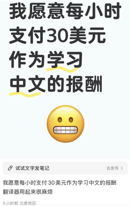 ▲許多外國網民在小紅書上發文稱“我愿意每小時支付30美元作為學習中文的報酬”。