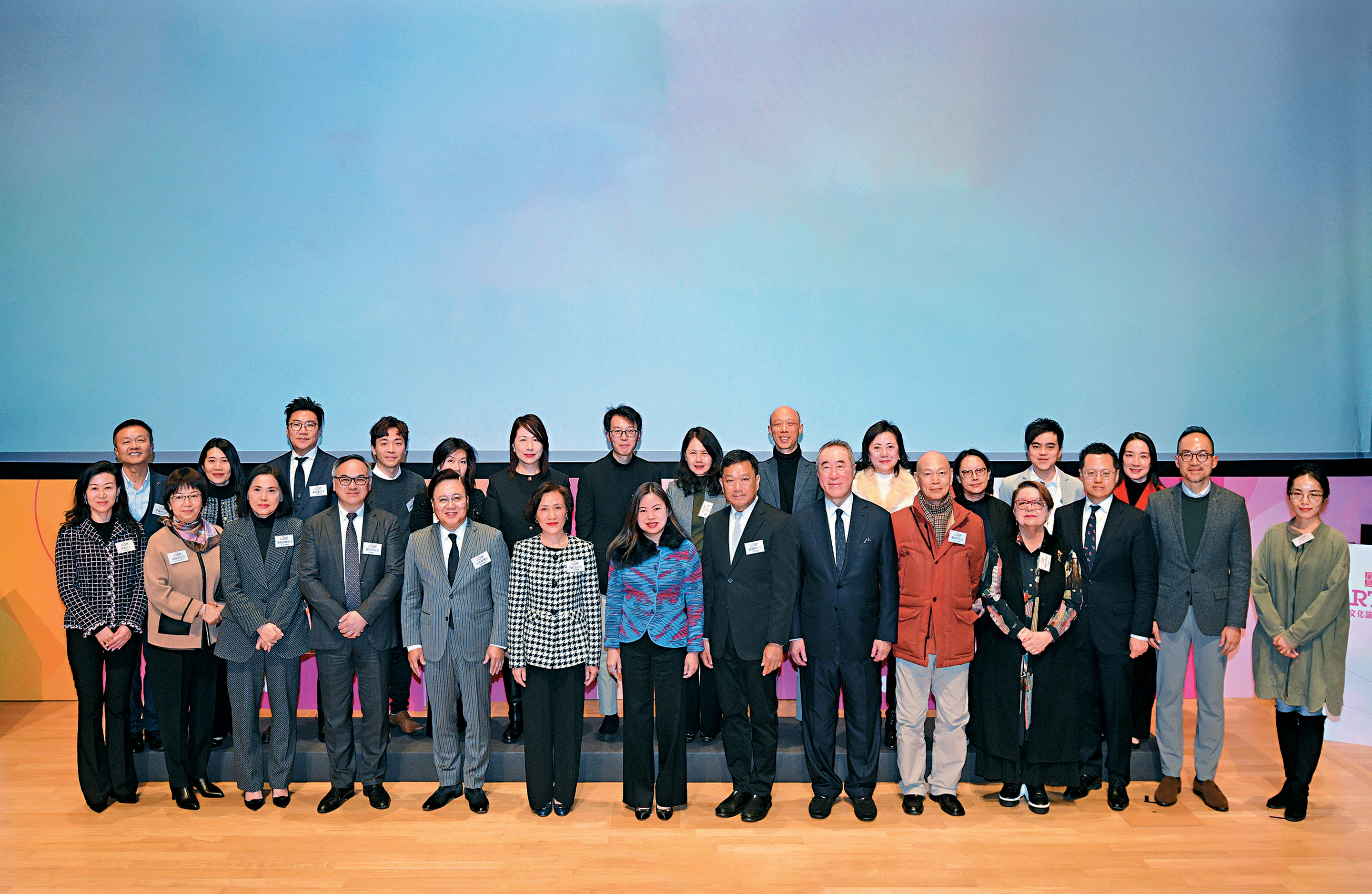 ▲活動主禮嘉賓文化體育及旅游局局長羅淑佩(左七)、專題演講嘉賓西九文化區管理局行政總裁馮程淑儀(左三)、部分評審團成員、10個獲獎機構代表及支持機構代表合照。