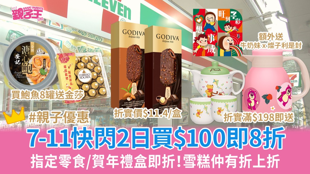 去拜年當然要先辦年貨,就趁今日(24日)7-11有2日快閃新春優惠,于1月24及25日買滿$100即有8折去掃貨喇! 就連雪糕、指定零食都滿$100有8折,折實滿$198再送上迪士尼“雙層真空暖暖壺”或“趣致 Tea Set” ,還額外送“不二家牛奶妹 x 燦子利是封”,提提大家,雪糕更有折上折優惠,即刻去7仔掃貨喇!