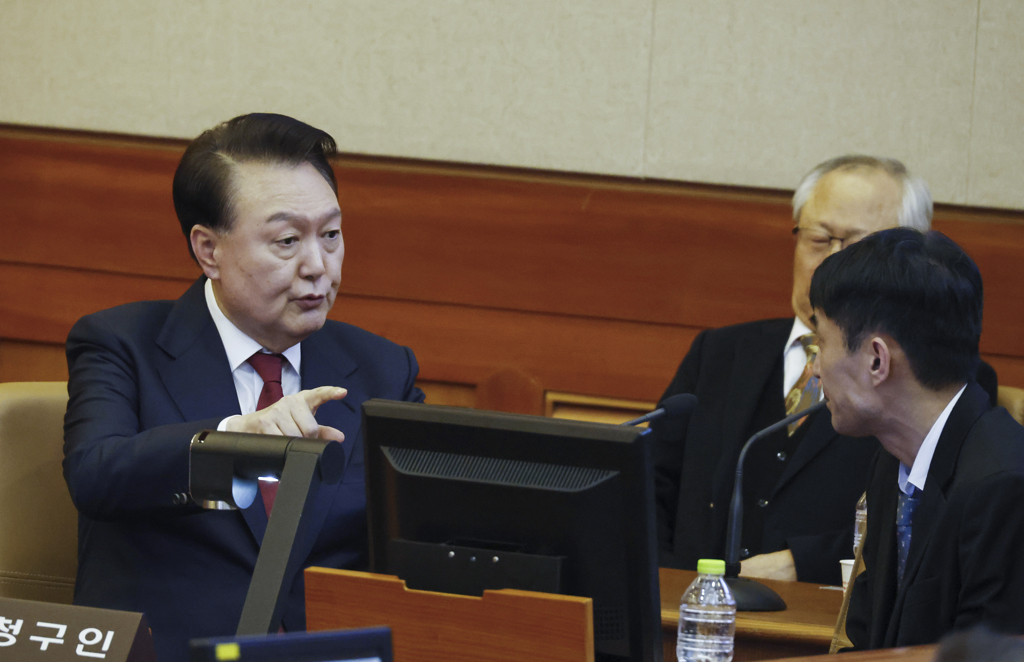 ▲因國會彈劾停職的韓國總統尹錫悅(左)23日赴憲法法院出席第4次庭審時與律師交談。(美聯社)